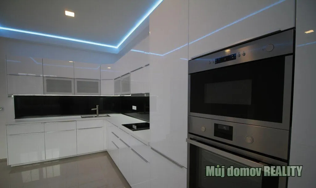 Stylová kuchyňská linka s LED podsvícením, indukční varná deska, myčka, mikrovlnná trouba a lednice.