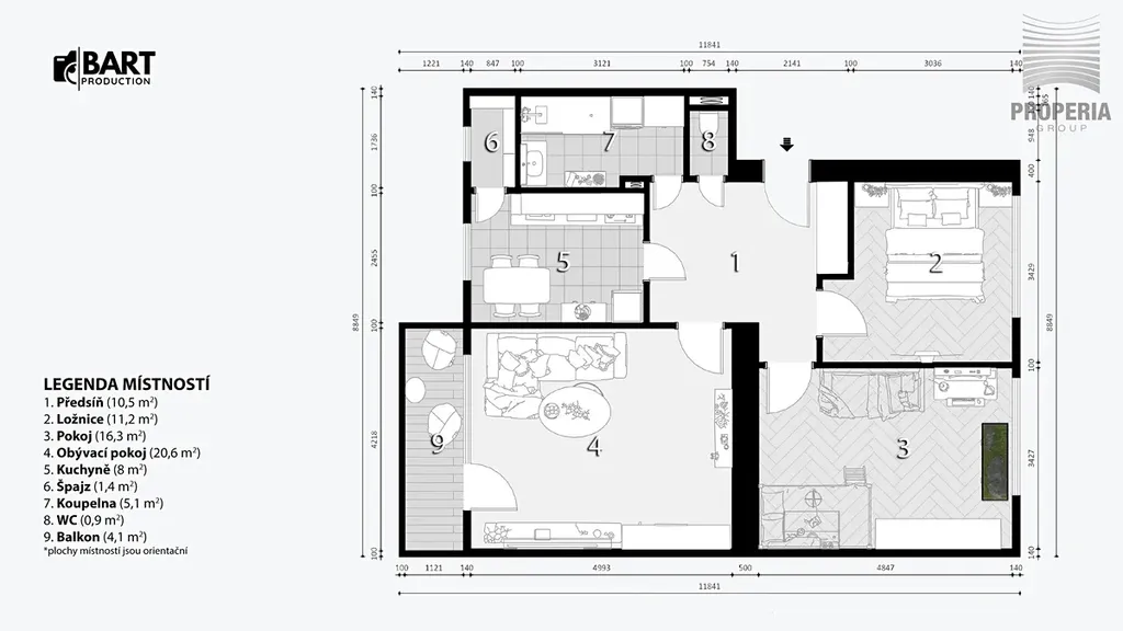 • Obývací pokoj (20,6 m²) – s přímým vstupem na balkon (4,1 m²)