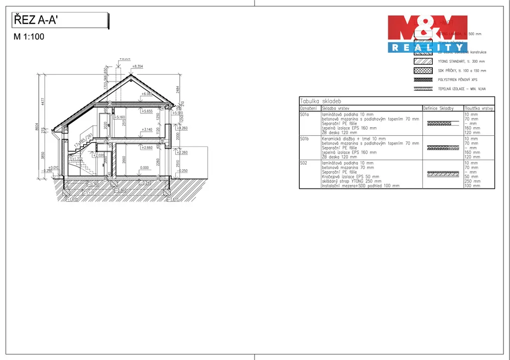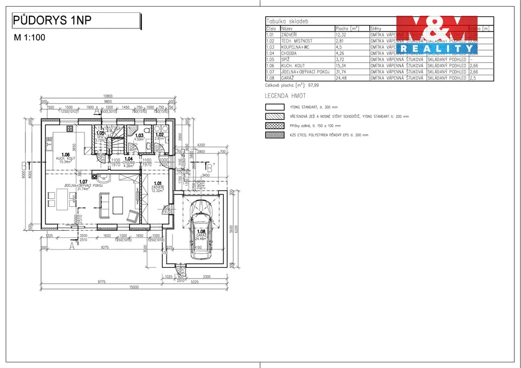 Dispozice domu je navržena s důrazem na funkčnost a pohodlí. V přízemí se nachází vstupní chodba, technická místnost, koupelna s WC, garáž a prostorný obývací pokoj s kuchyňským koutem a jídelnou, odkud je přímý vstup na terasu a zahradu. V patře jsou tři samostatné obytné místnosti, koupelna a samostatné WC.
