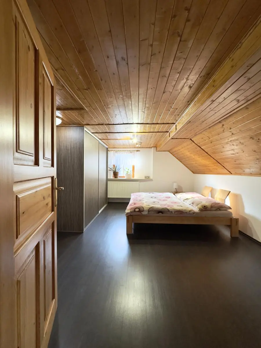 Samostatný byt 1+kk: Pokoj s kuchyňským koutem, nová koupelna se závěsným WC, vstup z hlavní části domu, vlastní samostatný vstup na zahradu, výhled na zahradu a les.