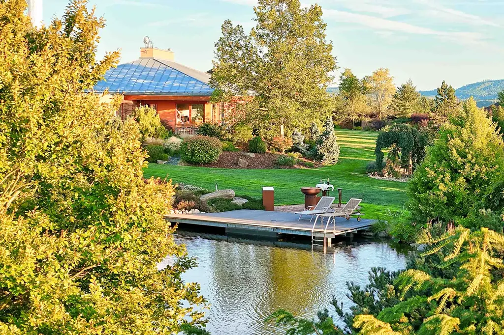 • moderní venkovní sauna citlivě zasazená v zeleni
