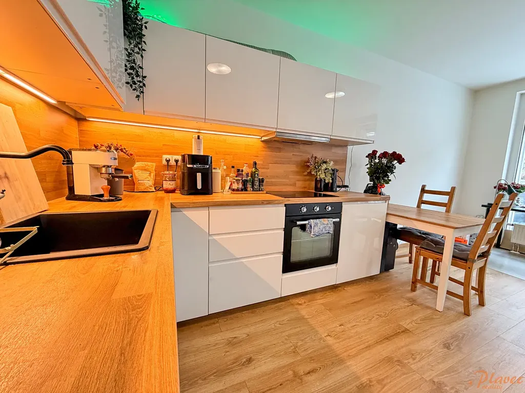 Byt je vybaven kuchyňskou linkou s elektrickou troubou, sklokeramickou deskou, lednicí, myčkou a v koupelně pračkou. Dále je byt vybaven elektrickými roletami.