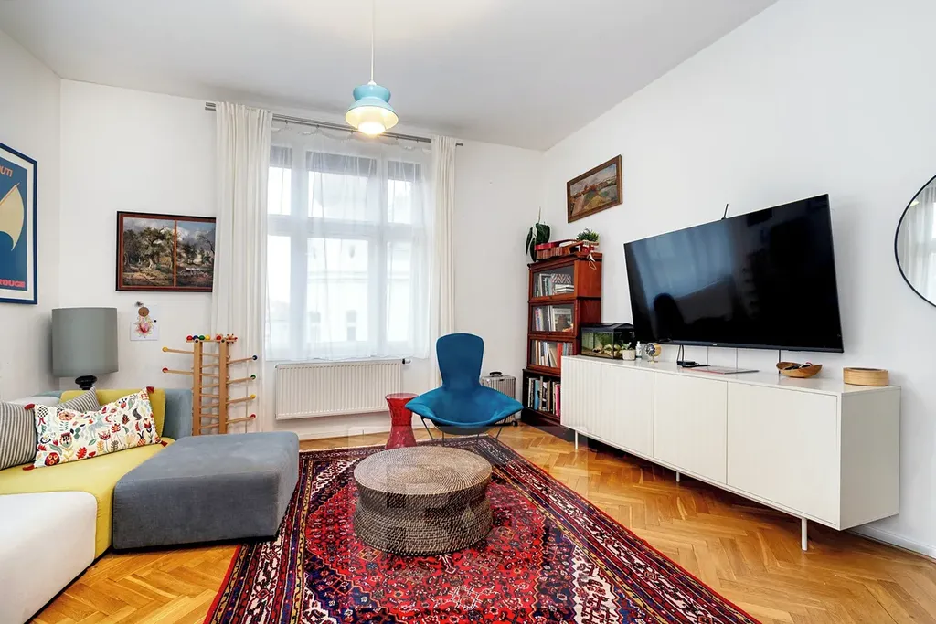 Byt působí velmi příjemně a vzdušně, a to i díky vyšší světlé výšce stropů. K bytu náleží sklepní kóje (2,2 m²).