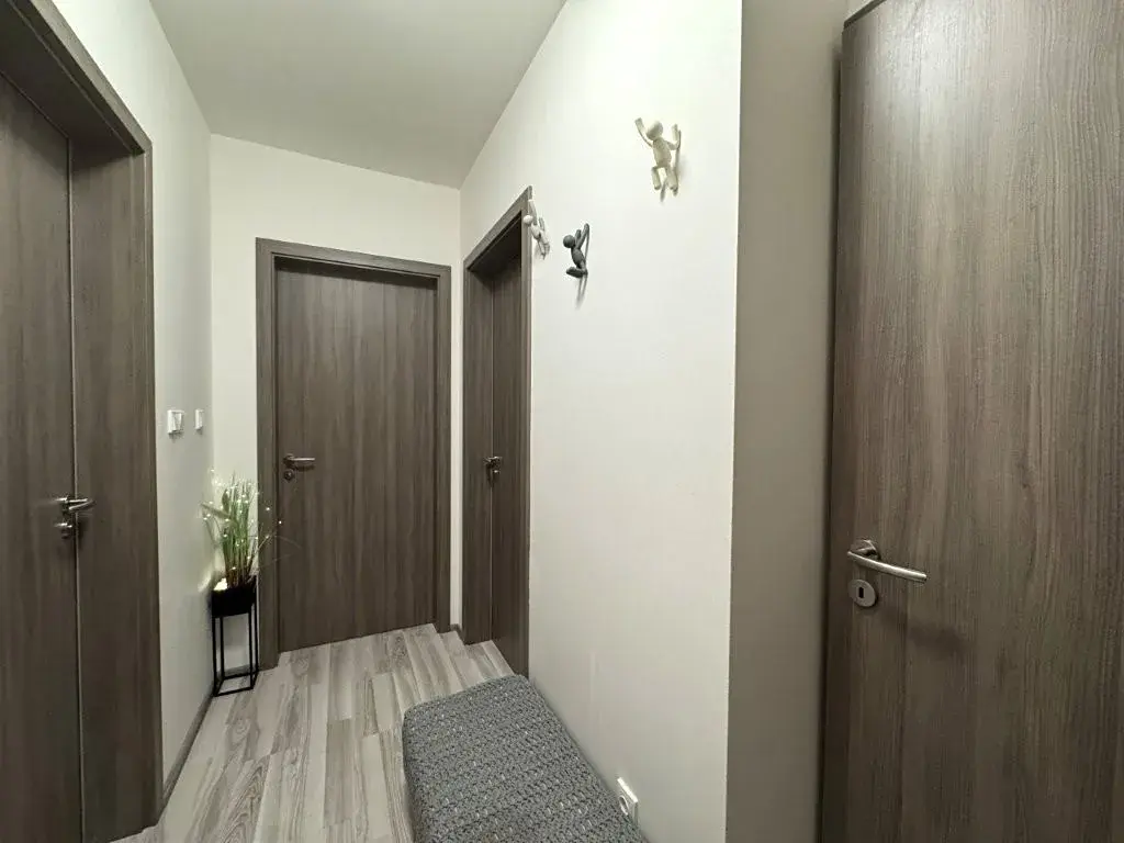 Po vstupu bezpečnostními dveřmi se ocitnete v předsíni (4,50 m²) vybavené botníkem a zrcadlem. Z chodby jsou samostatné vstupy do všech místností.
