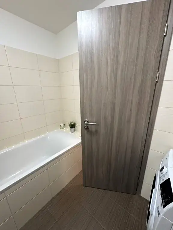 • Koupelna (4,92 m²) – vana, umyvadlo se skříňkou a zrcadlem, otopný žebřík, pračka značky AEG.
