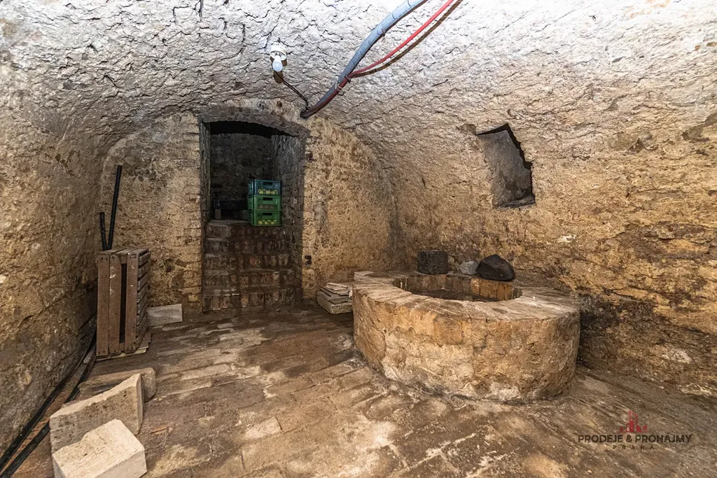 Jedny se nachází přímo po zahradou tohoto domu, vč. technické místnosti, kde je umístěn plynový kotel a kotel na pevná paliva. Další vedou z chodby domu a jsou zde dvoupodlažní klenuté kamenné sklepní prostory.