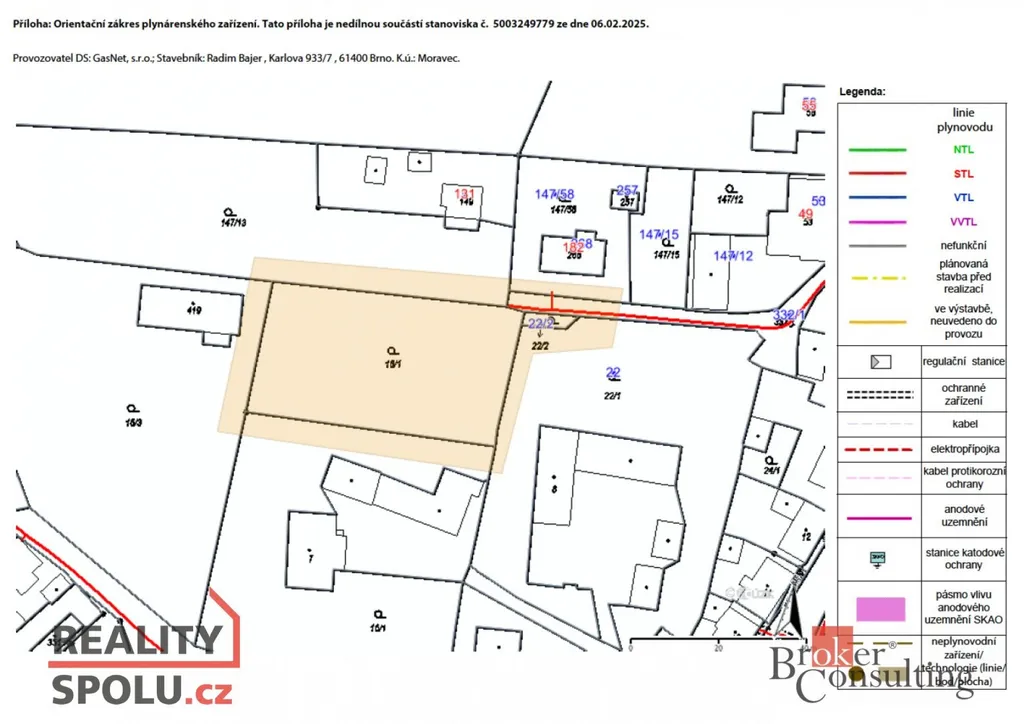 Středotlaké plynovodní potrubí vede přes vjezd až k sousední parcele č. 147/13 (orientační zákres mezi fotografiemi).