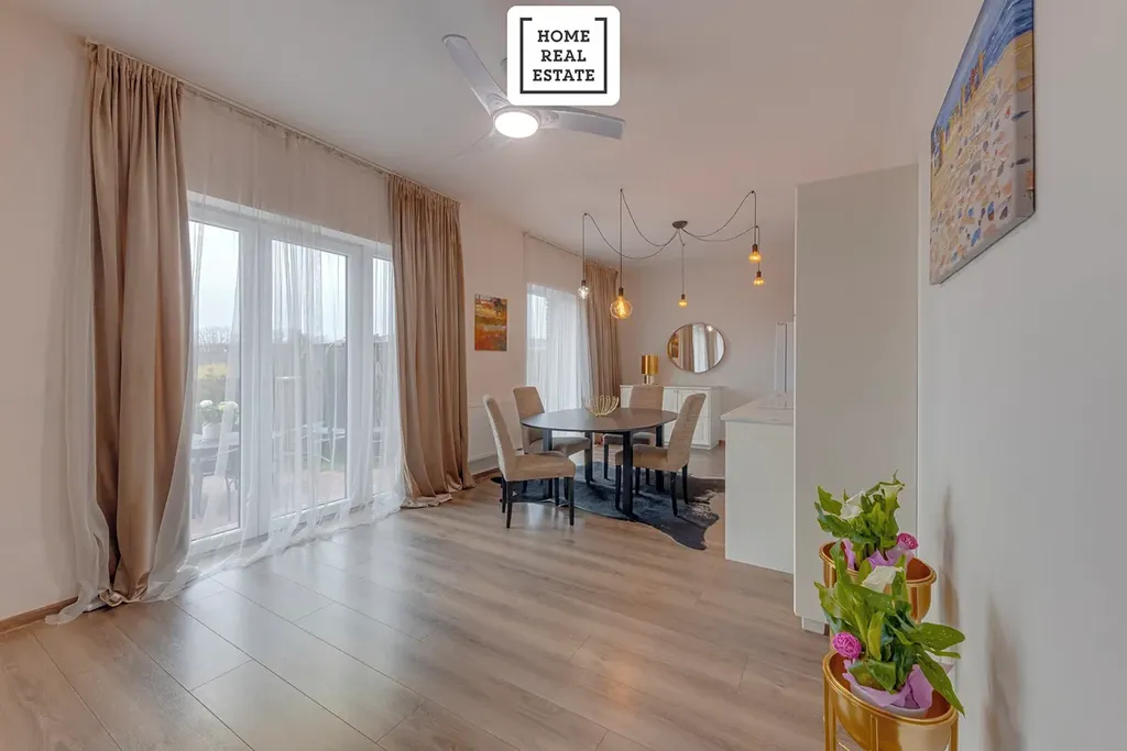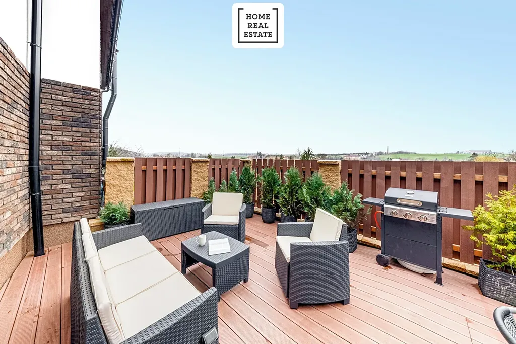 Obývací pokoj s kuchyňským koutem a spižírnou nabízí přímý vstup na terasu se zahrádkou. Master ložnice má vlastní sociální zařízení s WC, sprchovým koutem a umyvadlem. Dům má dále dva pokoje. Zahrada a terasa poskytují dostatek soukromí a nádherný výhled na hory Říp a Milešovka.