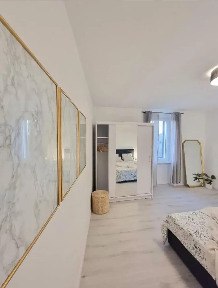 Obývací pokoj je velmi světlý a příjemný, vybavený velkou rohovou sedačkou, televizí a zrcadlem – ideální místo k odpočinku po dni stráveném objevováním města. Koupelna je rovněž kompletně zrekonstruovaná, s moderní sanitou a kvalitními materiály.