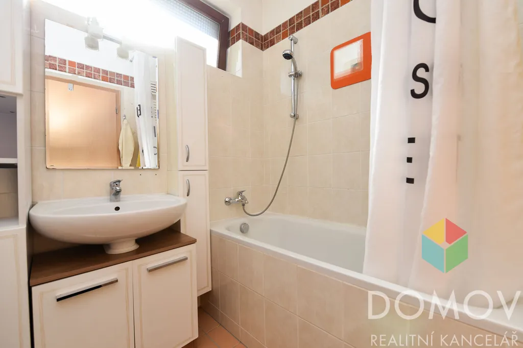 Plocha bytu činí 56 m2. Ze vstupní chodby s praktickou vestavěnou skříní se dostanete do obývacího pokoje s kuchyňskou linkou, která je vybavená lednicí i myčkou. Z chodby na druhou stranu vstoupíte do ložnice, která je vybavená vestavěnou skříní a komodou. V koupelně s oknem je vana, umyvadlo a WC. Na fotkách je vidět i nábytek a vybavení bývalých nájemců - v bytě nebude postel, pračka, kancelářská židle a pohovka. V ložnici zůstává komoda a skříň. V obývacím pokoji zůstane obývací stěna, stůl a židle.