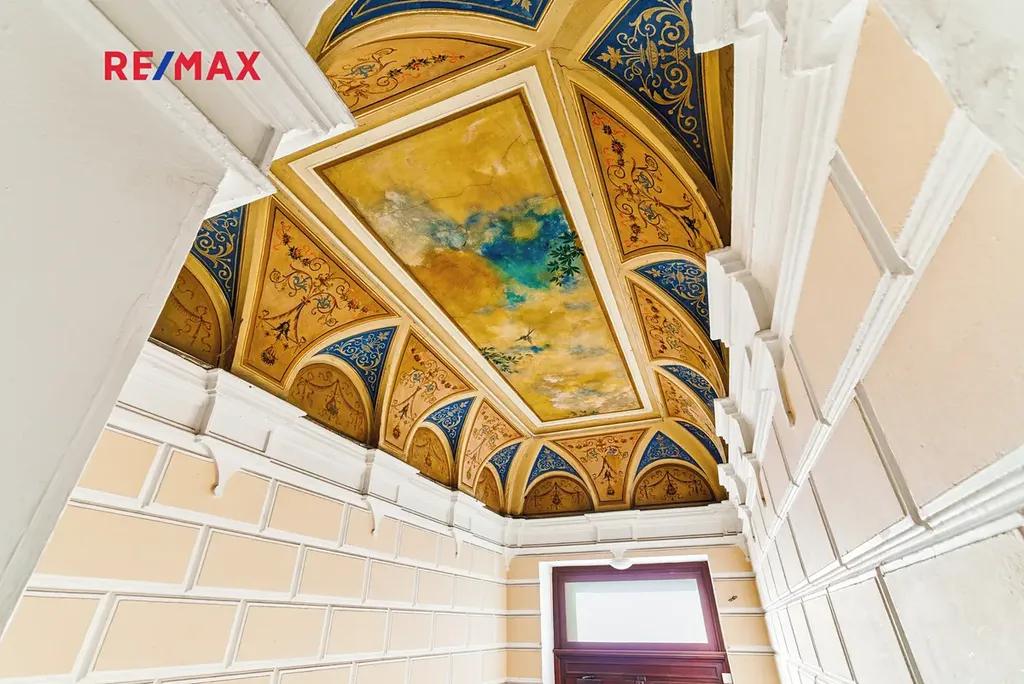 Vstupní prostory domu se zachovanými historickými prvky a zdobenými stropy.