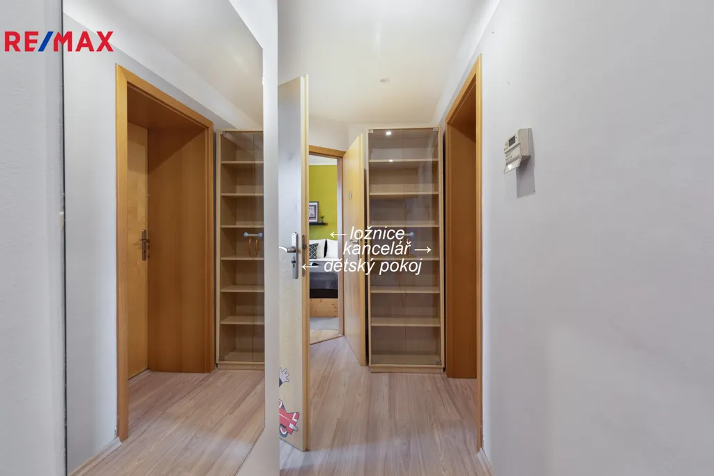 Ložnice a dětský pokoj jsou propojeny důmyslně řešenou šatnou. Prostorný obývací pokoj s jídelnou tvoří srdce bytu – místo pro rodinná setkání i klidné večery.