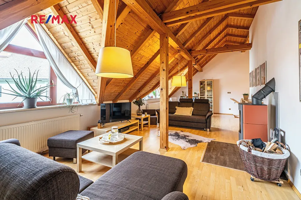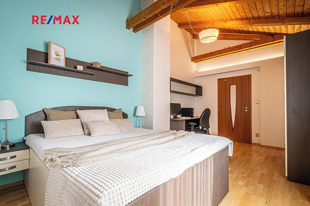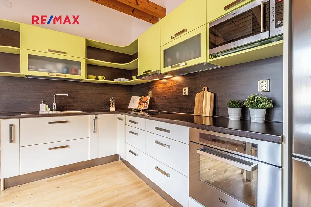 Horní byt (2+1 | 103,5 m²): Skutečná „vlajková loď“ domu. Moderní, vzdušný a velkorysý prostor kolaudovaný v roce 2014. Velké okna obývacího pokoje směřovaná na východ. Atmosféru podtrhují krbová kamna, která v zimě dodají teplo i útulnost. Ideální místo pro hlavní rodinné zázemí.