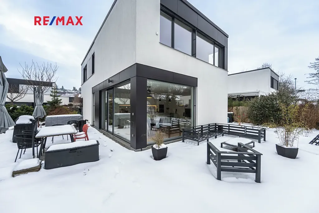 Dominantou domu je prostorný obývací pokoj (36 m2) s velkoformátovými okny a přímým vstupem na terasu a zahradu, který nabízí ničím nerušený výhled do zeleně a ideální prostor jak pro rodinný život, tak pro čas s přáteli.