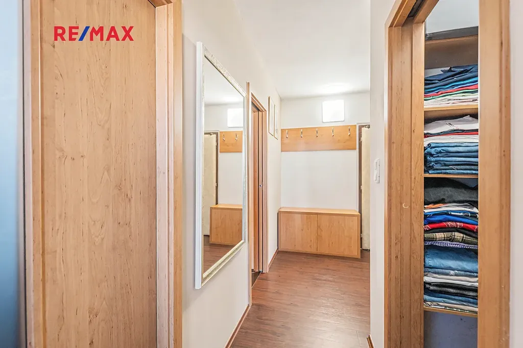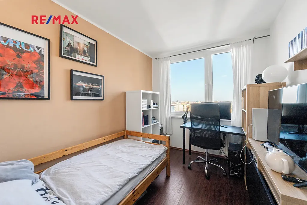 Dispoziční řešení bytu: Vstupní chodba, obývací pokoj s lodžií, šatna, koupelna s WC, pokoj, ložnice. Z ložnice a dětského pokoje je nádherný výhled na Prahu, lodžie nabízí výhled na vilovou zástavbu do zeleně.