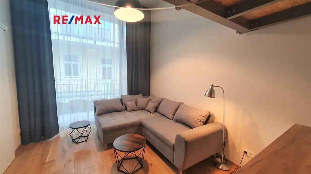 Byt sestává z předsíně, pokoje s kuchyňským koutem, patrem na spaní a koupelny s WC. Byt je nový, vkusně zařízený ve vysokém standardu. Díky vysokému stropu, 3,7 m, je v bytě pohodlné patro na spaní, s lůžkem i pro dvě osoby (šířka 160 cm). Dostatek úložného prostoru umožňuje vestavěná skříň v předsíni. Kuchyňský kout je plně vybaven (sporák s troubou, myčka nádobí, lednice), v koupelně je sprchový kout, umyvadlo a pračka.