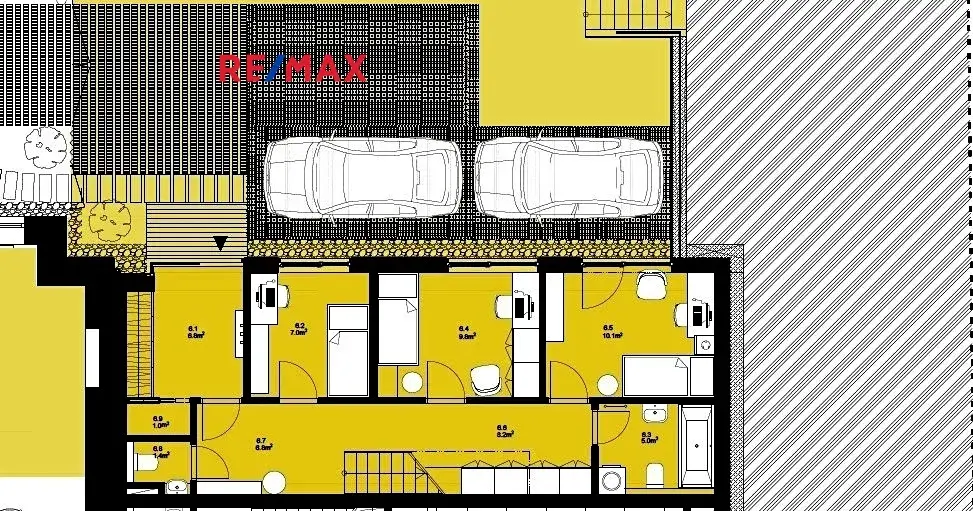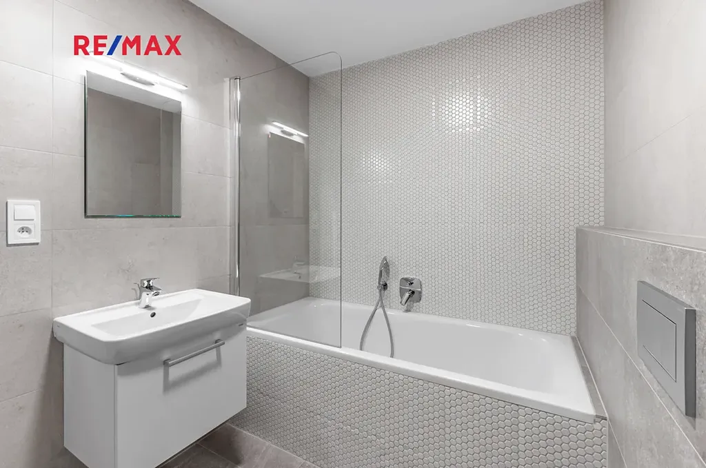 a samozřejmostí je i klimatizace. Byt se nachází v prvním a druhém nadzemním podlaží. Z prostorné vstupní haly (7 m2) doplněné menší komorou a vestavnou skříní se vchází do chodby odkud jsou přístupné tři místnosti, dvě ložnice (každá 10 m2) a pracovna či další ložnice pro hosty (7 m2). Z jedné z těchto ložnic je i přímý výstup na spodní část pozemku, která se užívá pouze s tímto bytem. V tomto podlaží je k dispozici ještě koupelna s vanou a WC a také samostatné WC s umyvadlem. Z chodby vystoupáte po dřevěném schodišti do velkorysého obývacího pokoje o velikosti 42 m2 s kuchyňskou linkou. Ta je vybavena lednicí s mrazákem, myčkou, dřezem, varnou deskou a elektrickou troubou. Odvětrání je zajištěno pomocí digestoře. Z obývacího pokoje za kuchyní pak vejdete do ložnice rodičů (13,6 m2), která je doplněna vlastní koupelnou se sprchovým koutem a WC. Více v přiložených půdorysech. Dominantou obývacího pokoje je velká prosklená stěna, na kterou navazuje zpevněná dřevěná terasa (15 m2) s jižní orientací. Okolo východní a jižní strany bytu se nachází dvouúrovňová předzahrádka spojená schodištěm. U vstupu do bytu pak jsou k dispozici 2 parkovací stání, která je možno si pronajmout spolu s bytem - obě za 3.000,- Kč měsíčně.