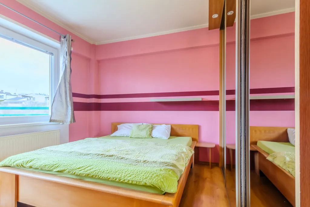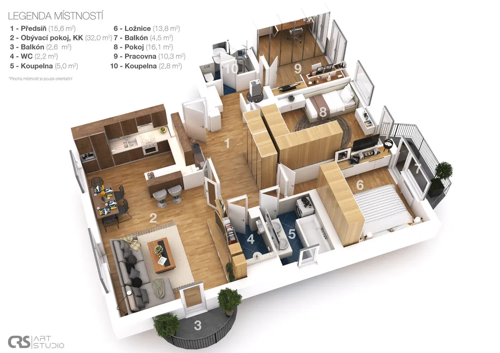 Byt nabízí tři samostatné pokoje – ložnici, dětský pokoj a pracovnu (ideální home office), takže pohodlně funguje i pro větší rodinu nebo kombinaci bydlení a práce z domova. Velkým plusem jsou dvě koupelny + samostatné WC, což výrazně zvyšuje komfort každodenního fungování.
