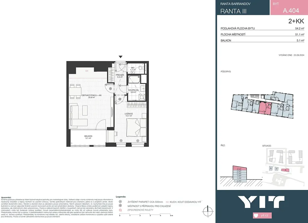 Byt 2+kk o celkové rozloze 54,2 m² s balkónem 5,1 m² je situován v 4.NP projektu RANTA Barrandov III. Cena zahrnuje bytovou jednotku, sklepní kóji a DPH. K bytu náleží i parkovací stání, které není zahrnuto v ceně. Cena parkovacího stání od 665 500 Kč včetně DPH.