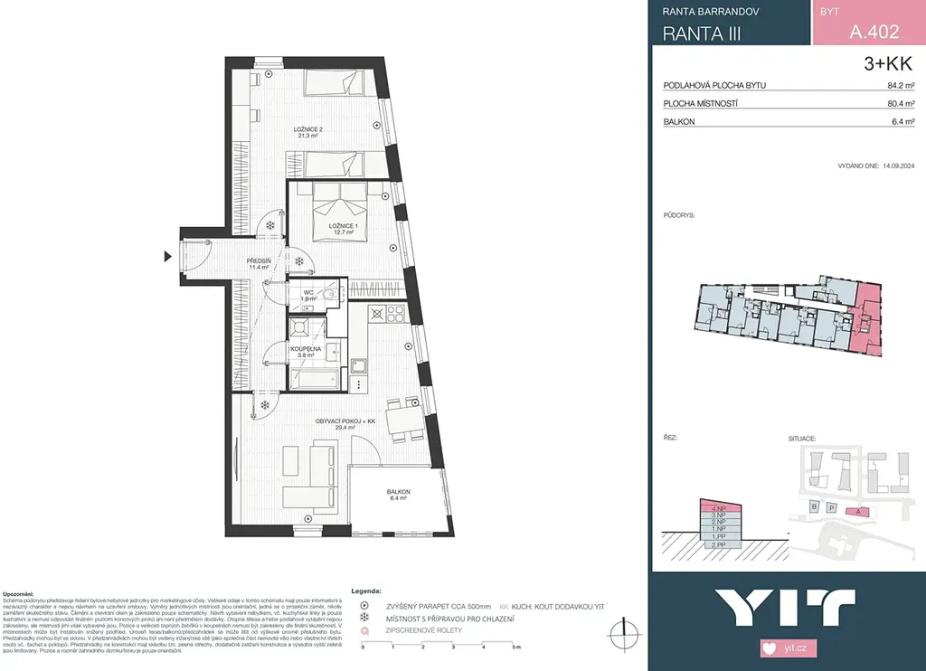 Byt 3+kk o celkové rozloze 84,2 m² s balkónem 6,4 m² je situován v 4.NP projektu RANTA Barrandov III. Cena zahrnuje bytovou jednotku, sklepní kóji a DPH. K bytu náleží i parkovací stání, které není zahrnuto v ceně. Cena parkovacího stání od 665 500 Kč včetně DPH.