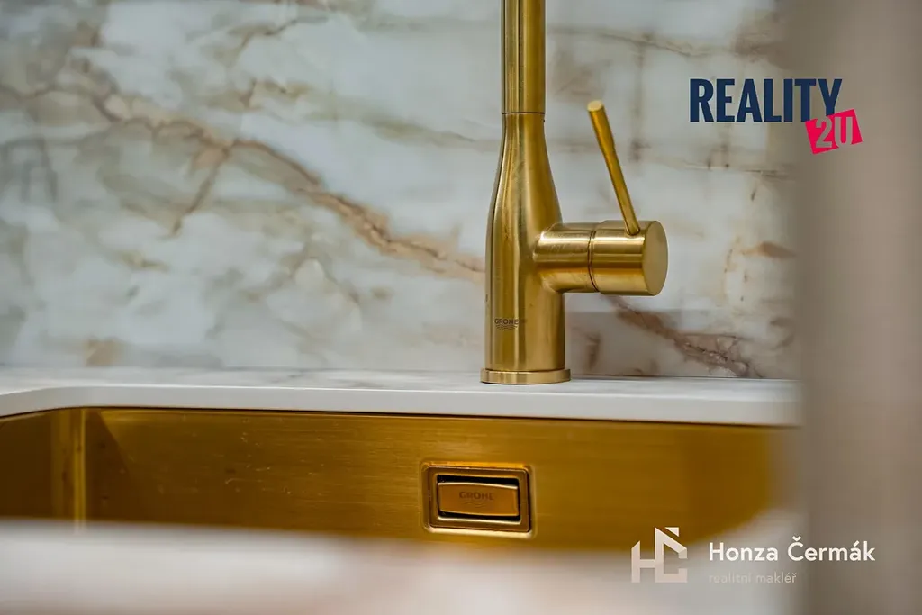 Srdcem bytu je stylová kuchyňská linka vybavená špičkovými vestavnými spotřebiči. K dispozici je myčka, lednice s mrazákem, trouba, indukční deska i výkonná digestoř. Celý prostor je doladěn do posledního detailu včetně elegantního dřezu a mramorového dekoru, který koresponduje s vysokým standardem vybavení. Nechybí ani technické zázemí v podobě pračky a sušičky, které jsou diskrétně zabudovány přímo v bytě v rámci úložných prostor.