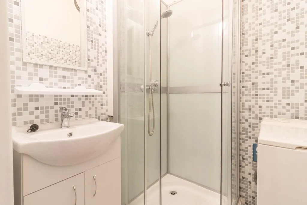 V koupelně je sprchový kout, umyvadlo se zrcadlem a pračka. WC je odděleně. Ve vstupní chodbě jsou vestavěné skříně s úložným prostorem. K bytu patří sklepní kóje.