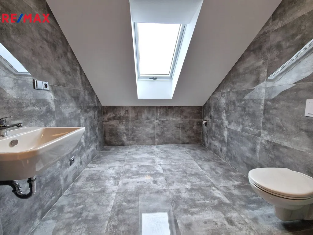 Byt tvoří vstupní předsíň (7,6 m2), ložnice (10,5 m2), obývací pokoj + kk (21,5 m2), pokoj (14,3 m2) a koupelna se sprchovým koutem, umyvadlem a wc (8,1 m2). Moderní komfortní kuchyňská linka je vybavená myčkou, ledničkou s mrazákem a digestoří. Dveře i obložkové zárubně jsou v dekoru dřeva, střešní okna jsou kombinace dřevo/plast. Byt je vytápěn tepelným čerpadlem (vzduch/vzduch) a podlahovým topením. Na předsíni je umístěný elektrický kotel, ohřev vody zajišťuje bojler umístěný v koupelně. Po půdních výsuvných schodech, umístěných v předsíni se dostáváme do půdního prostoru, který představuje další velkorysé možnosti využití. Při rekonstrukci byl kladen velký důraz na protihlukovou izolaci – protihlukový sádrokarton, PUR, kročejová podlahová izolace.