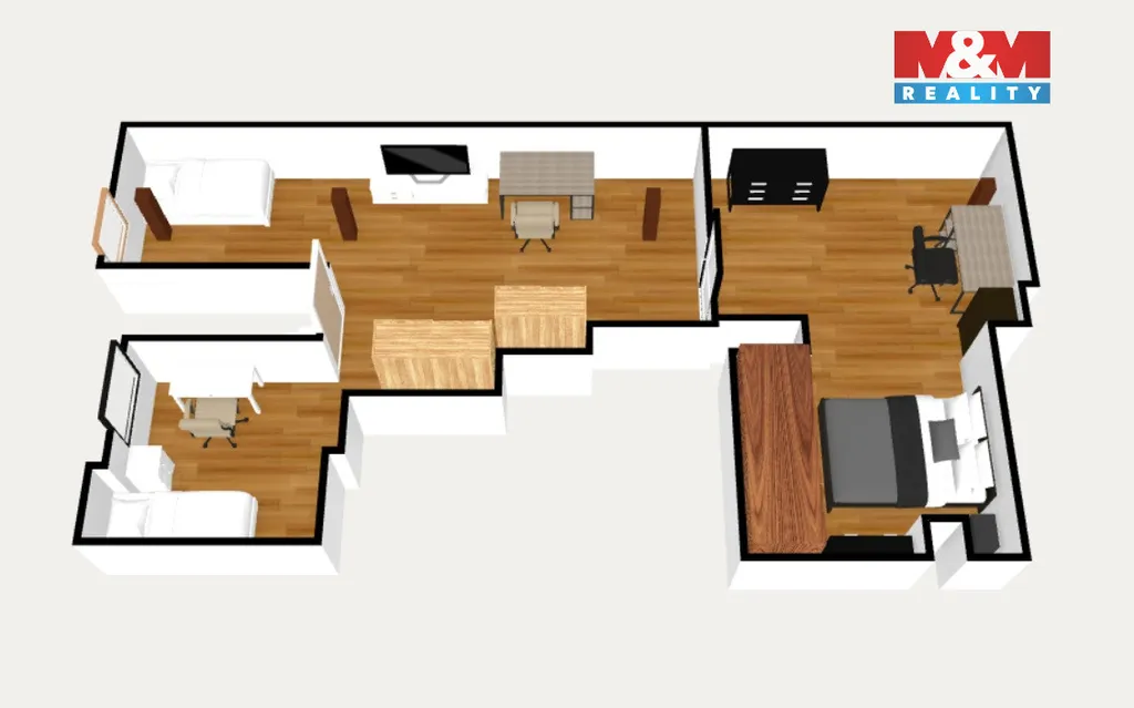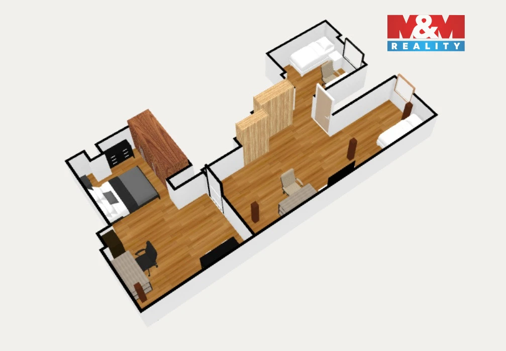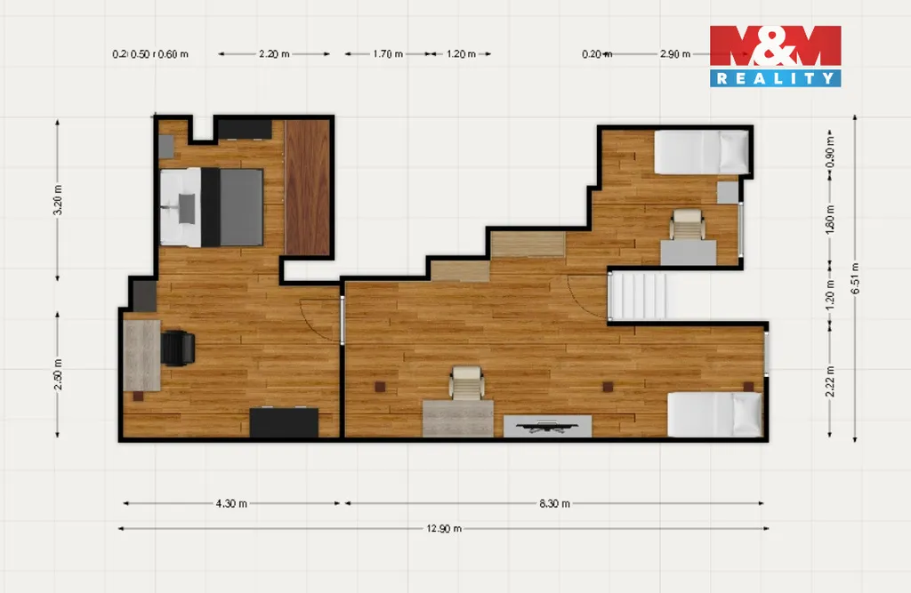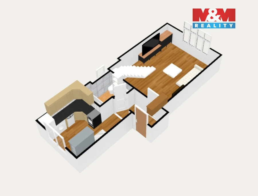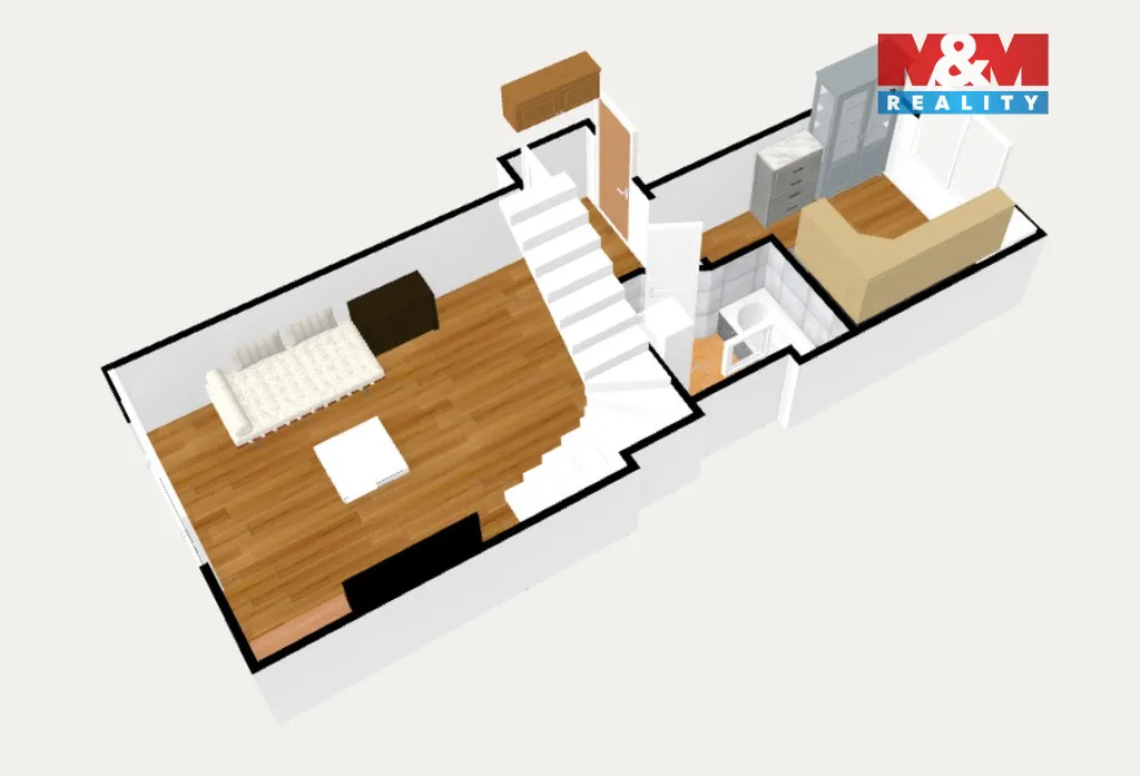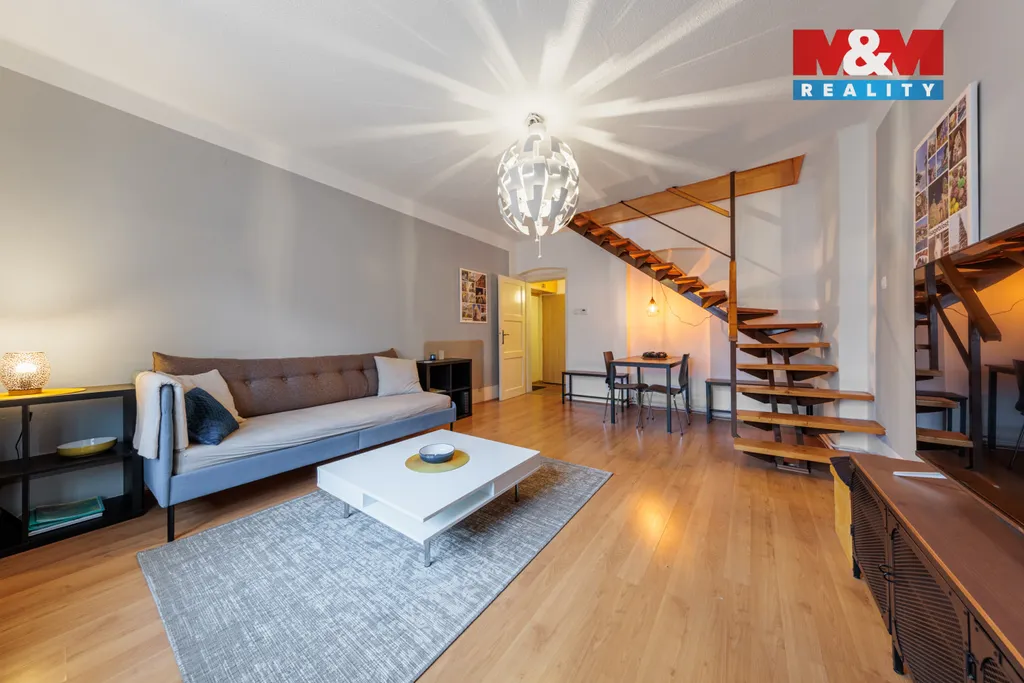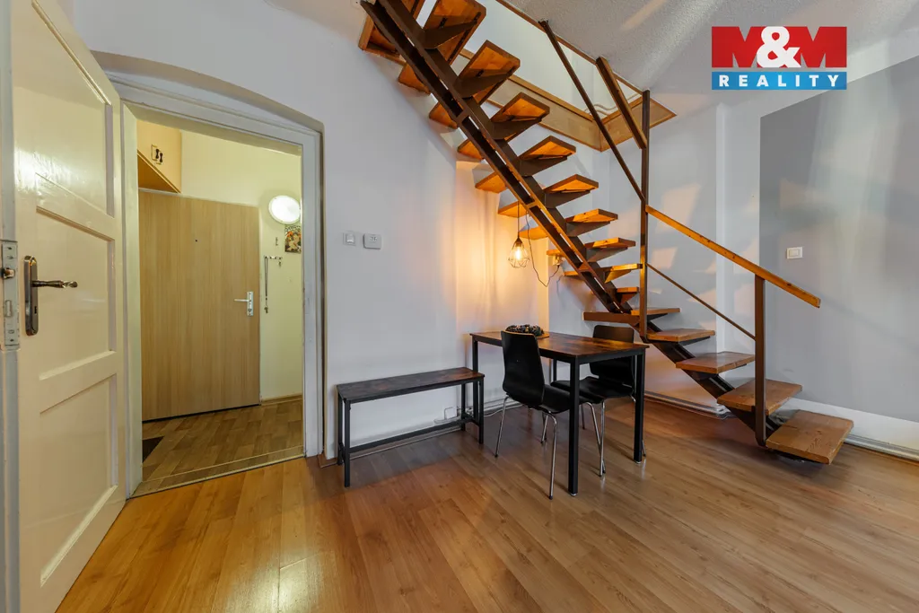 Byt je rozdělen do dvou podlaží. Ve spodní části je kuchyně, koupelna a velkorysý obývací pokoj se schodištěm do podkroví. Horní patro nabízí útulnou atmosféru se šikmými stropy, trámy a třemi pokoji – ideálními pro ložnici, děti či pracovnu.