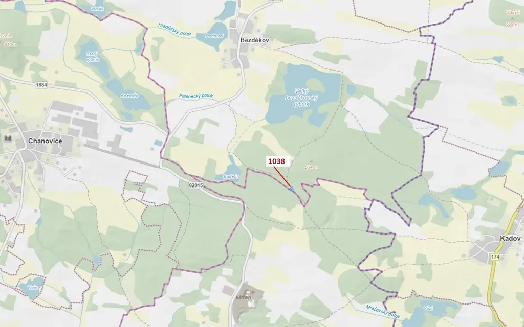 Lesní pozemek o výměře 1 028 m2, parcelní číslo 1038, podíl 1/1, katastrální území Bezděkov u Kasejovic, obec Hradiště, obec s rozšířenou působností Nepomuk, okres Plzeň-jih, Plzeňský kraj. Po těžbě.