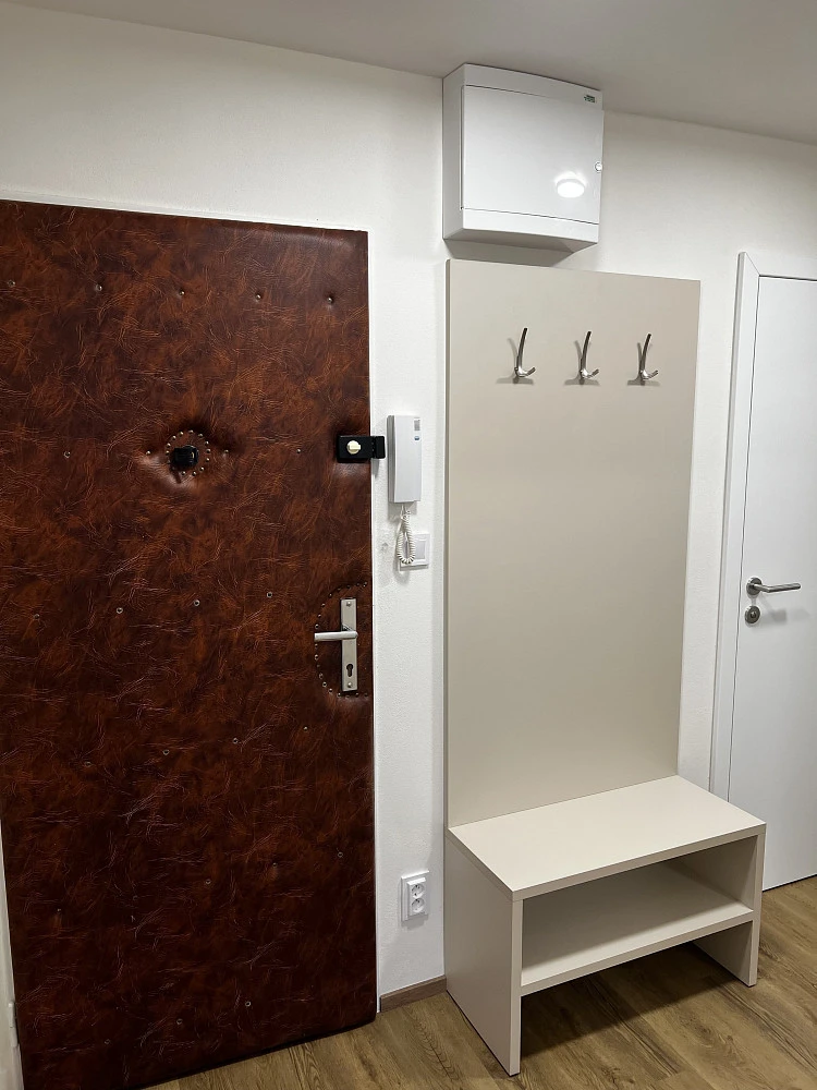 Vstupní chodba je vybavena věšákovou stěnou s botníkem na sezení od výrobce nábytku, společnosti HANÁK NÁBYTEK. V chodbě je spoustu prostoru na odložení si věcí při vstupu do bytu. Na chodbu navazuje malá šatna/příruční sklad v rámci samostatné místnosti.