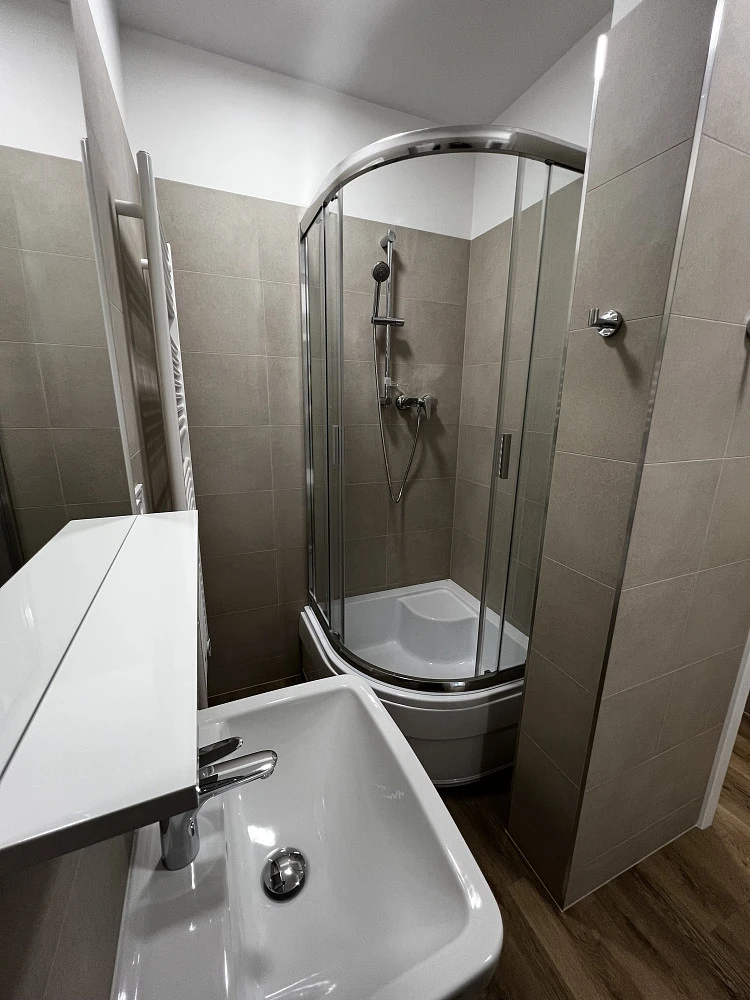 Moderní koupelna se sprchovým koutem s vyvýšenou vaničkou a sezením, kde je možné pohodlně koupat i malé děti, , umyvadlo, zrcadlo s nasvícením, přívod pro pračku a sušičku, otopný žebřík na sušení ručníků, ventilátor na odvod par. Samostatné WC s automatickým ventilátorem.