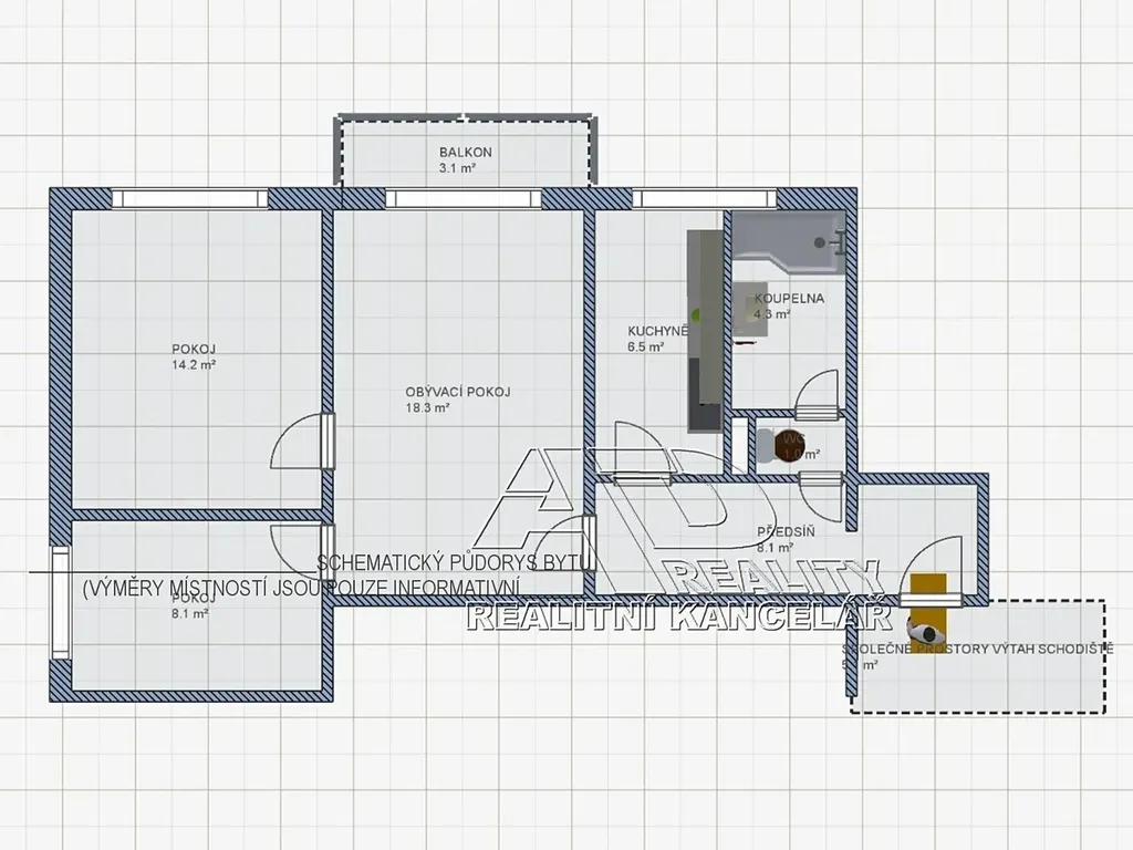 Dispozice bytu: obývací pokoj [18,4m2], samostatná ložnice [14,3m2], pokoj [8,1m2], kuchyňský kout / kuchyně [6,5m2], předsíň [8,5m2], koupelna WC [5,4m2]. K bytu je k dispozici sklepní kóje v 1.NP (technické podlaží – přízemí) domu o výměře cca [2,2m2]. Topení v bytě centrální / ústřední dálkové (radiátory), podružné měření spotřeby teplé a studené vody (vodoměry), samostatné měření spotřeby elektřiny (elektroměr). V bytě je možnost připojení internetu (Starnet) a STA.