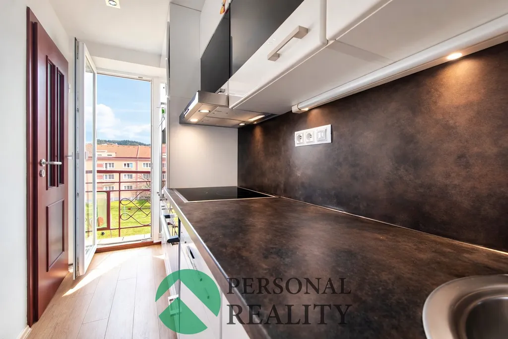 Kuchyňský kout je vybaven kvalitní kuchyňskou linkou a disponuje francouzským oknem orientovaným na východ, které zajišťuje dostatek přirozeného světla po celý den.