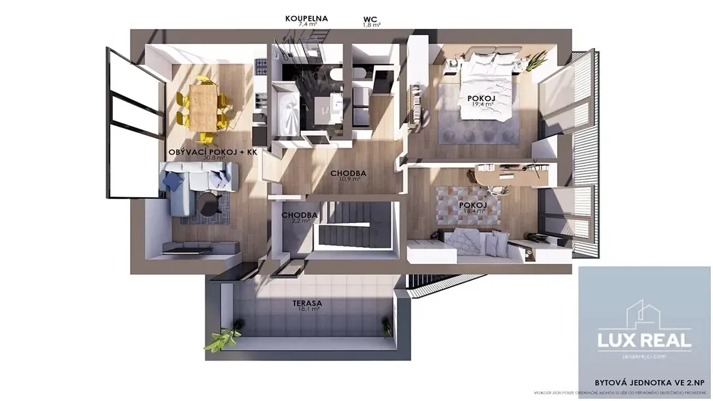 2.NP - pokoj, ložnice, dětský pokoj, koupelna, WC a přes terasu opět vstup na zahradu.