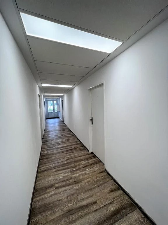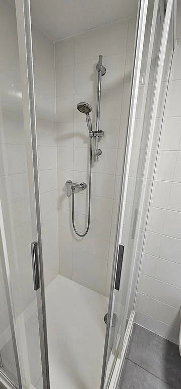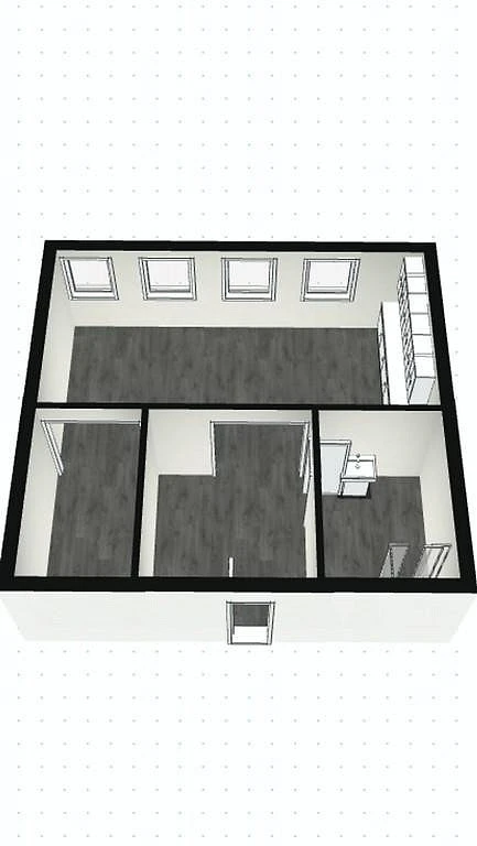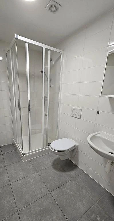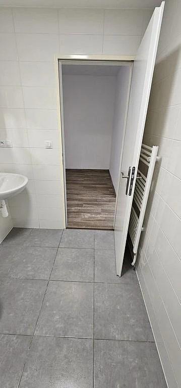 Za vstupními dveřmi bytu se nachází menší chodba, po levé straně je koupelna se sprchovým koutem, závěsnou toaletou, umyvadlem, zrcadlovou skříňkou a otopným žebříkem. Hlavní dominantou bytu je útulný obytný pokoj s kuchyňskou linkou, který vzhledem ke své velikosti lze opticky rozdělit na dvě místnosti tak jak to udělali současní nájemci. Kuchyňská linka je vybavena lednicí, dřezem a varnou dvou plotýnkou.