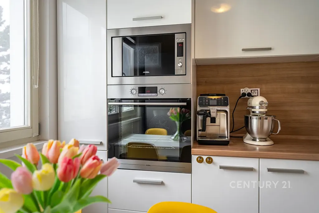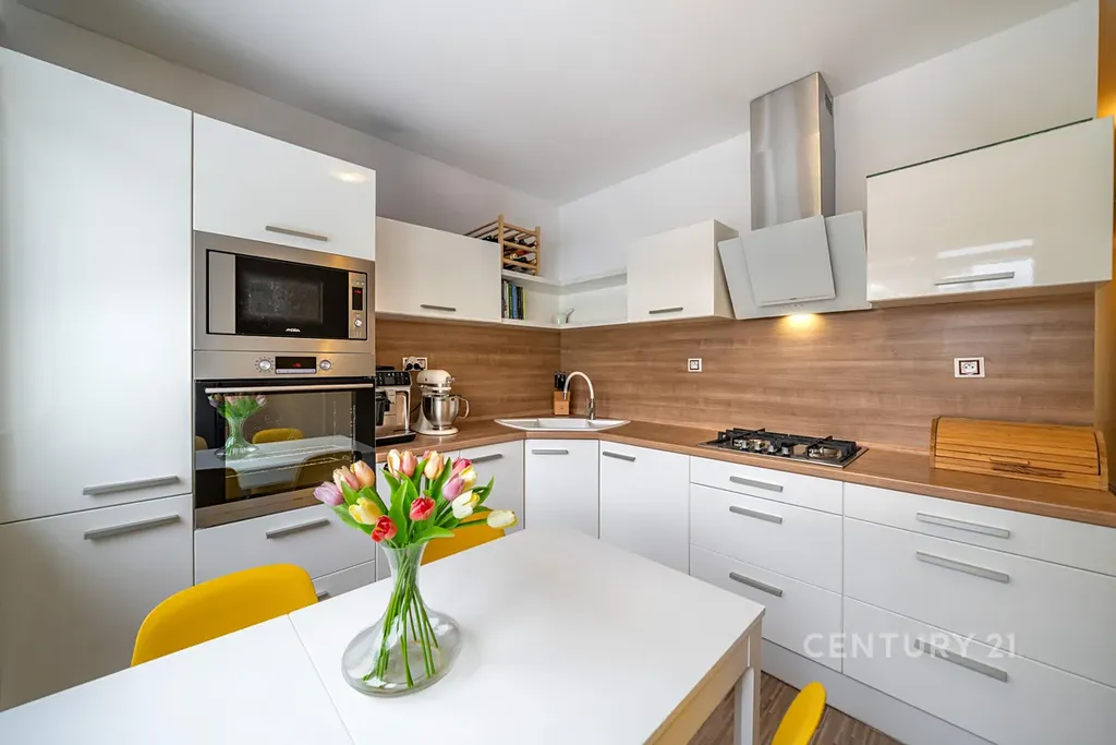 Kuchyně (12 m²): Moderní linka s vestavěnými spotřebiči Mora (trouba, mikrovlnka, myčka) a plynovou varnou deskou (revize 01/2026).