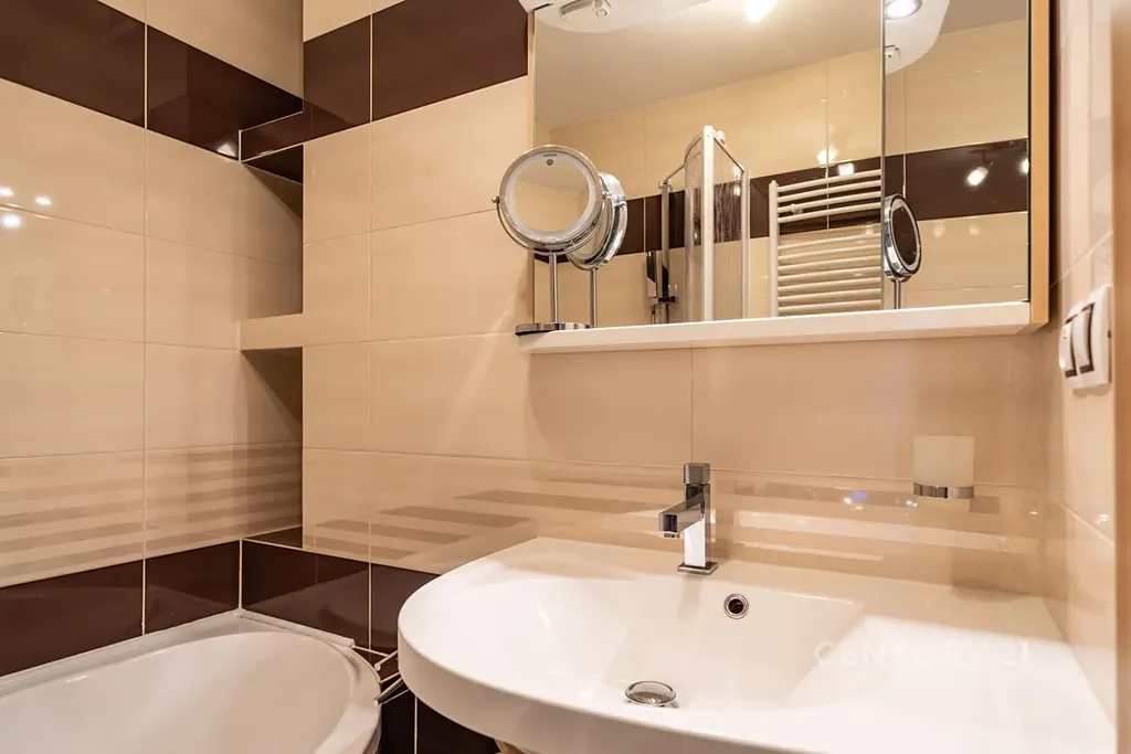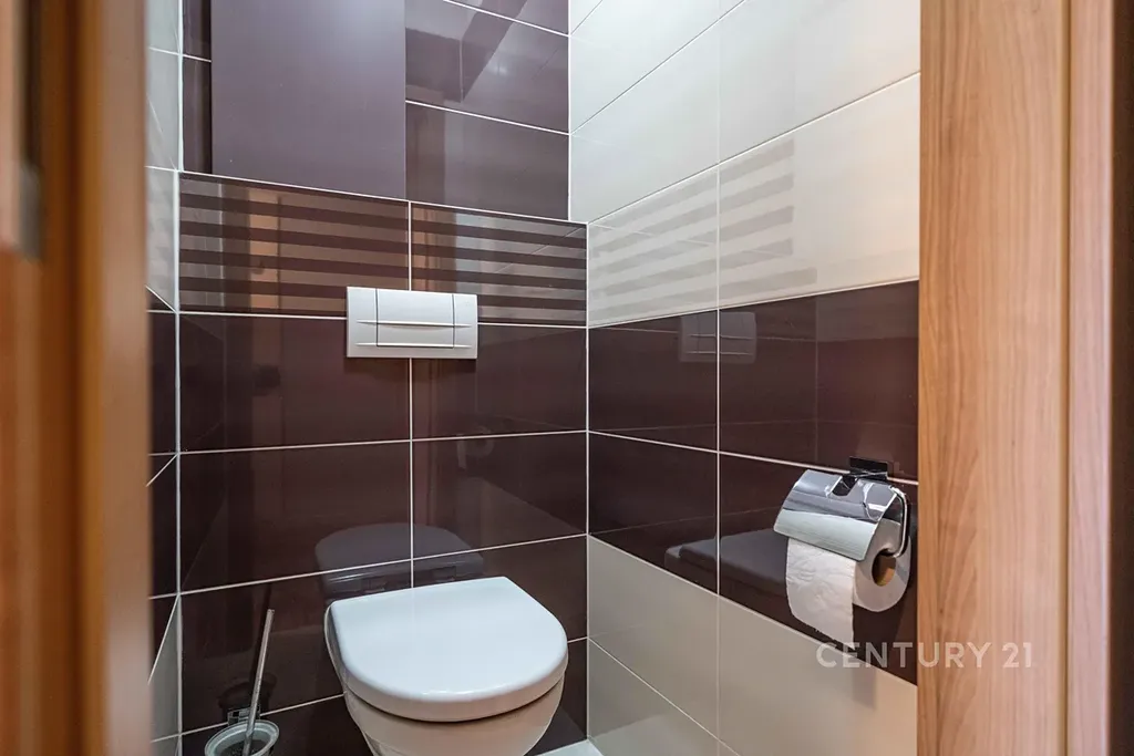 Koupelna a WC: Zděné jádro v moderním obkladu, v koupelně vana a nová pračka (pořízena 05/2025).