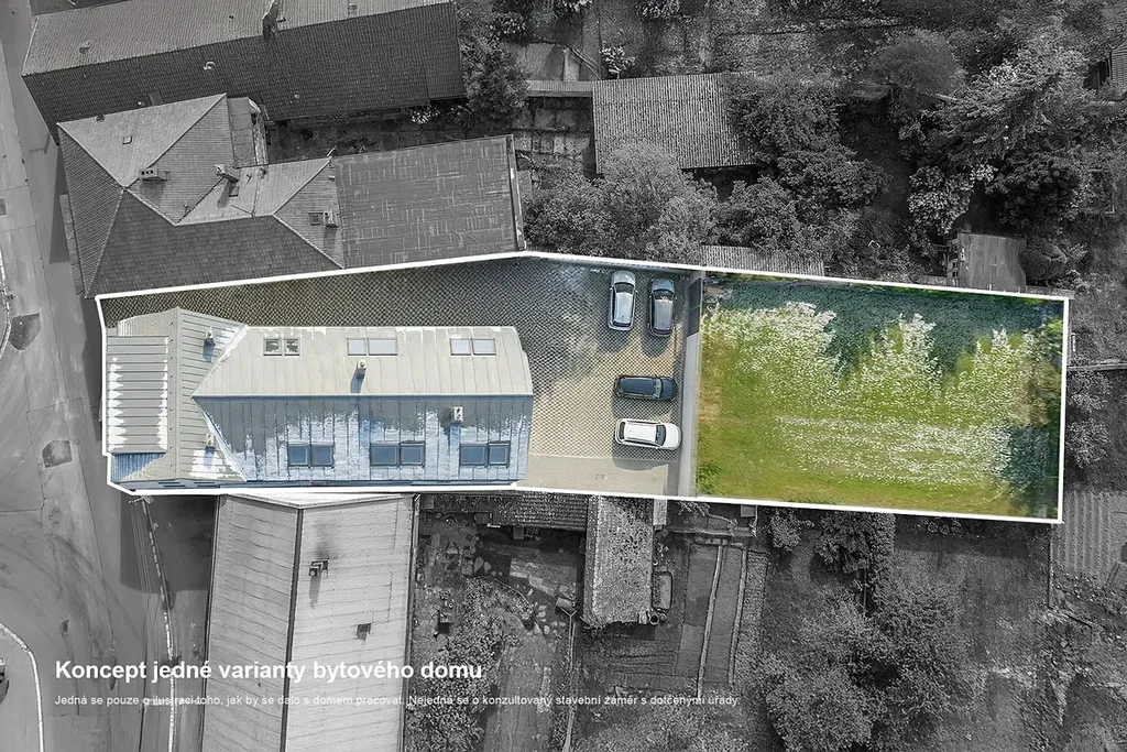 Po demolici starých hospodářských budov je možné realizovat velkorysé parkování na vlastním pozemku ve vnitrobloku za domem. Vjezd na pozemk dvoukřídlými vraty. Možné využít zahradu a rozdělit ji například dle počtu bytových jednotek v domě.
