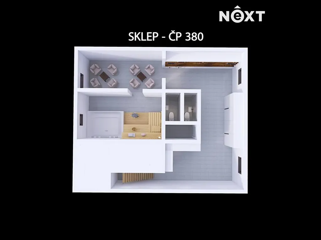 Jak jsem zmínil na začátku, tak dům má dvě čísla popisné a díky tomu může vzniknout jeden samostatný apartmán, který bude dispozičně řešen jako 3kk se sociálním zařízením v 1.NP i 2.NP a disponoval by kapacitou 4 lůžek s přistýlkami pro děti. Tohle bylo zamýšleno s prvním číslem popisným a v druhém se toho dá vymýšlet podstatně více. Ještě než budu pokračovat, tak je třeba zmínit, že ve studii se počítá se změnou vstupu do domu od cesty. Vezmu to trošku netradičně od sklepa...