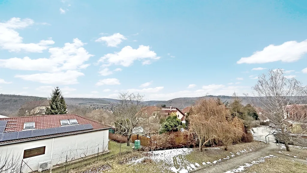 Byt se nachází ve 2. nadzemním podlaží a díky svému umístění na kopci nabízí krásné, otevřené výhledy do tří světových stran. Řídká okolní zástavba a umístění na konci slepé ulice zajišťuje nadstandardní míru soukromí – do oken vám nikdo nenahlíží, takže si můžete naplno užívat klid a pohodu domova.