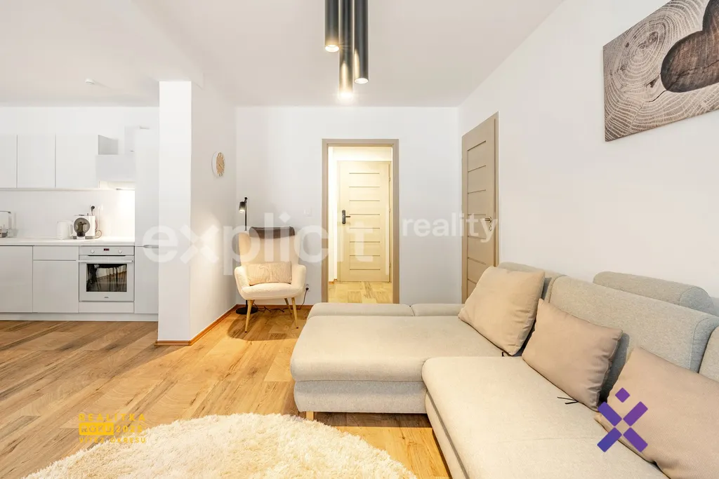 Z chodby se plynule dostanete do hlavního obytného prostoru, který tvoří vzdušný celek obývacího pokoje a kuchyně. Kuchyně je mírně oddělená, ale přesto zůstává součástí jednoho otevřeného prostoru, což vytváří velmi příjemnou atmosféru. Obývací část je zařízena sedací soupravou, konferenčním stolkem a televizí, ideální pro odpočinek i společné chvíle.