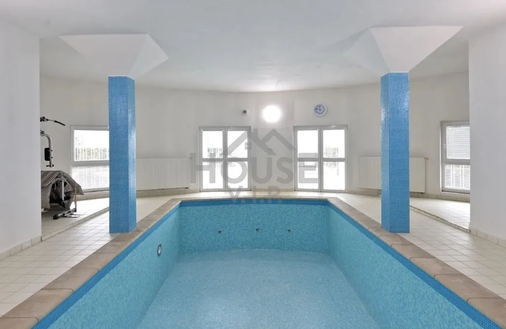 Zakrytý vnitřní bazén, sauna, sprcha, toaleta a technické zázemí. Přímý vstup na terasu a zahradu zajišťuje komfortní relaxaci nebo možnost pořádání firemních či společenských akcí.