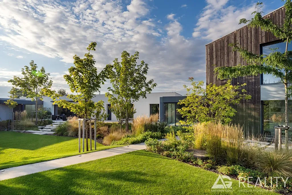 Součástí komplexu je také prostorná dvougaráž a zastřešené parkování pro další vozy, které podtrhují eleganci celého projektu.