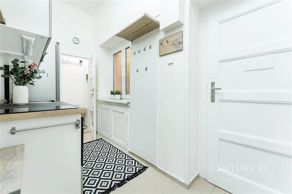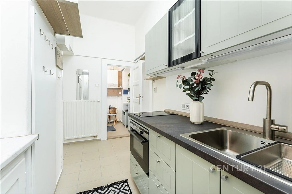 Kuchyňský kout se zbrusu novou linkou se spotřebiči disponuje velkým oknem do světlého a vzdušného světlíku. Obývací pokoj a ložnice jsou orientovány do jednosměrné a klidné ulice Biskupcova.