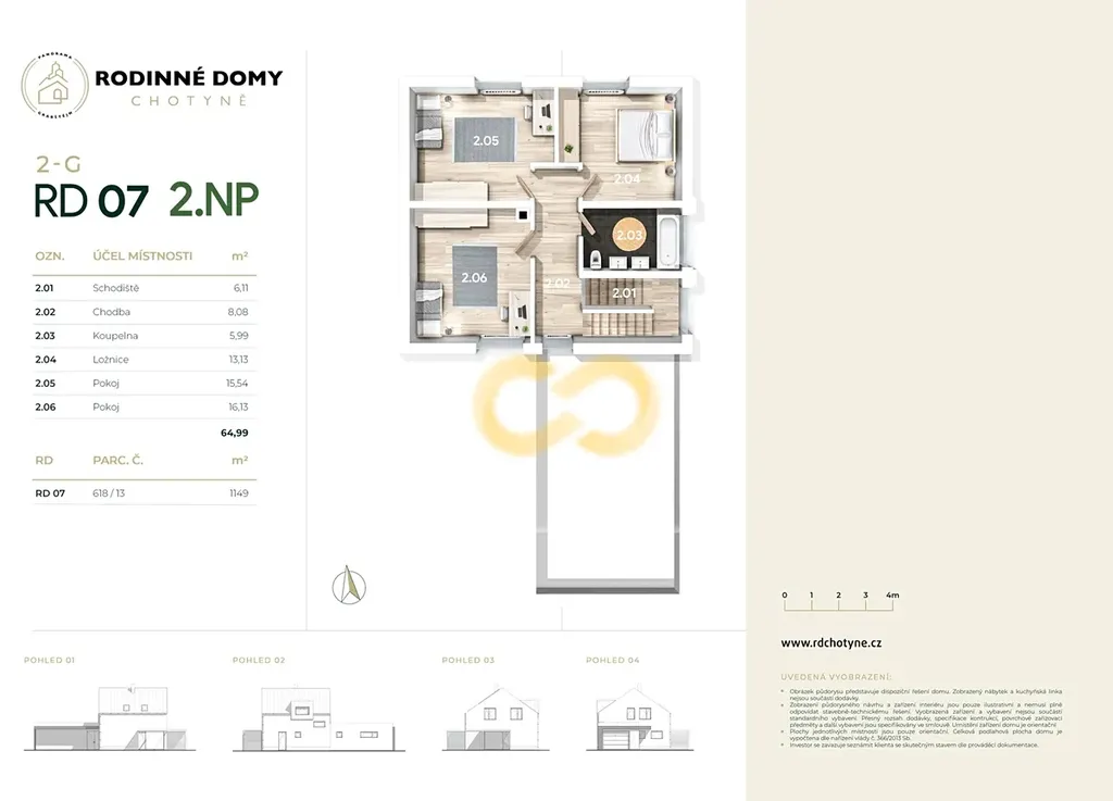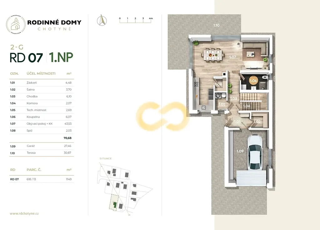 Dům č. 7 má dispozici 4+kk a užitnou plochu 194 m². Stojí na pozemku o velikosti 1 149 m² a součástí je garáž i velká zahrada.