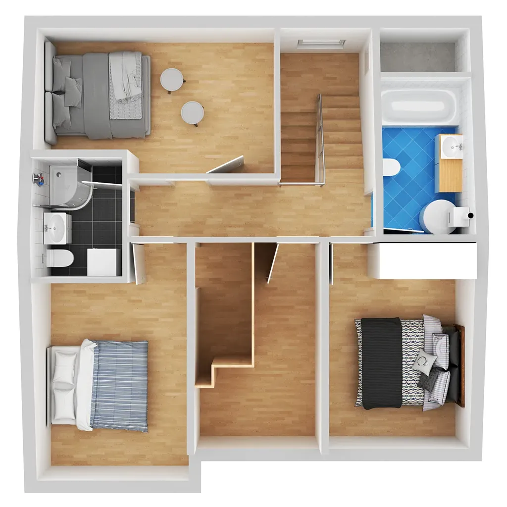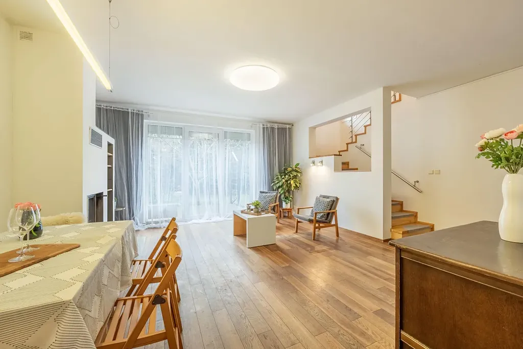 V přízemí se nachází předsíň s wc a šatnou, za ní následuje kuchyň a obývací pokoj, ze kterého jde schodiště do patra. Obývací pokoj je světlý a orientován do zahrádky, na něj navazuje kuchyně s oknem na předzahrádku. V patře najdeme dvakrát kouplenu (jedna s vanou a jedna se sprchovým koutem), šatnu a čtyři pokoje, z nichž jeden je využíván jako pracovna. Obytná plocha 114,9m2, plus garáž 23,4m2. Velikost pozemku 222m2.