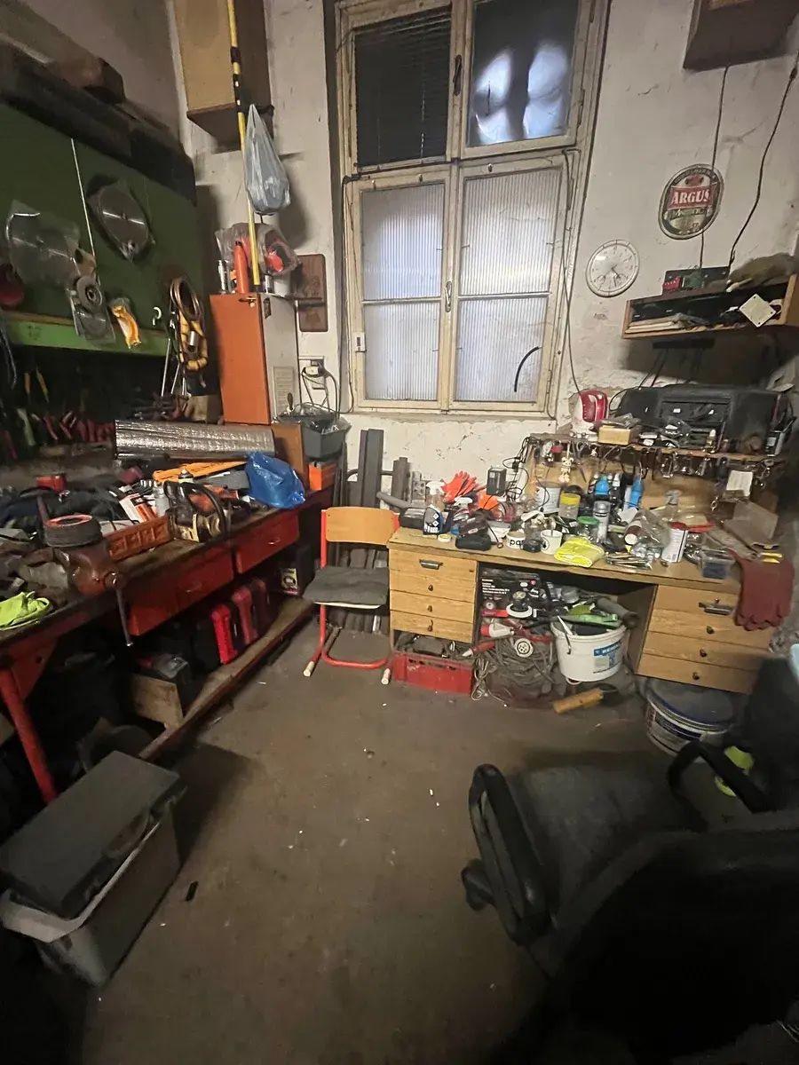 V domě v přízemí je veliký sklepní prostor a dvě garáže, přičemž jedna z nich je větší a prostor je využit navíc i jako dílna.