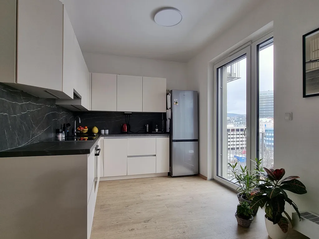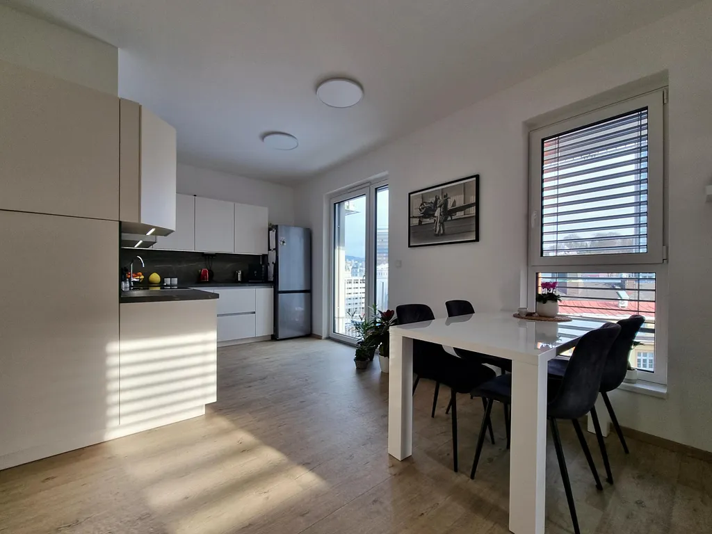 Dispozice bytu: obývací pokoj s částečně odděleným kuchyňským koutem (27 m²) - čtyři velká okna včetně balkonu (4 m²), neprůchozí ložnice (13 m²), koupelna se zděným sprchovým koutem a skleněnou zástěnou; malé okno, koupelnový nábytek, zrcadlo, přípojka na pračku 600 mm (velikost 5 m²) - podlahové vytápění, samostatné WC + umývátko, prostorná vstupní hala - předsíň (9 m²) - součástí vestavěné skříně a věšáková stěna. Součástí je prakticky řešená rohová kuchyňská linka v moderním bílo-šedém designu - vybavena indukční sklokeramickou varnou deskou, elektrickou horkovzdušnou troubou, digestoří, myčkou - vyšší standard, max. úložný systém. Venkovní - zatemňovací rolety ve všech oknech na dálkové ovládání, vkusné stropní osvětlení - dálkový ovladač, jednotný světlý odstín podlah v designu dřevo, kvalitní plastová okna (protihluk), dva výtahy v domě, dálkové vytápění. Nechybí ani bezpečná a velká sklepní kóje v suterénu domu. Slunná orientace bytu na jihozápad - vyšší podlaží je naprostou výhodou městského bydlení.
