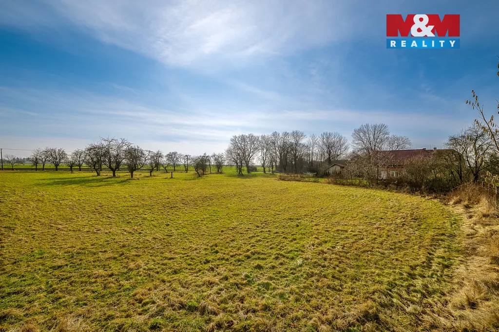 Rozlehlý, částečně oplocený pozemek na okraji obce nabízí krásný výhled do okolní krajiny.