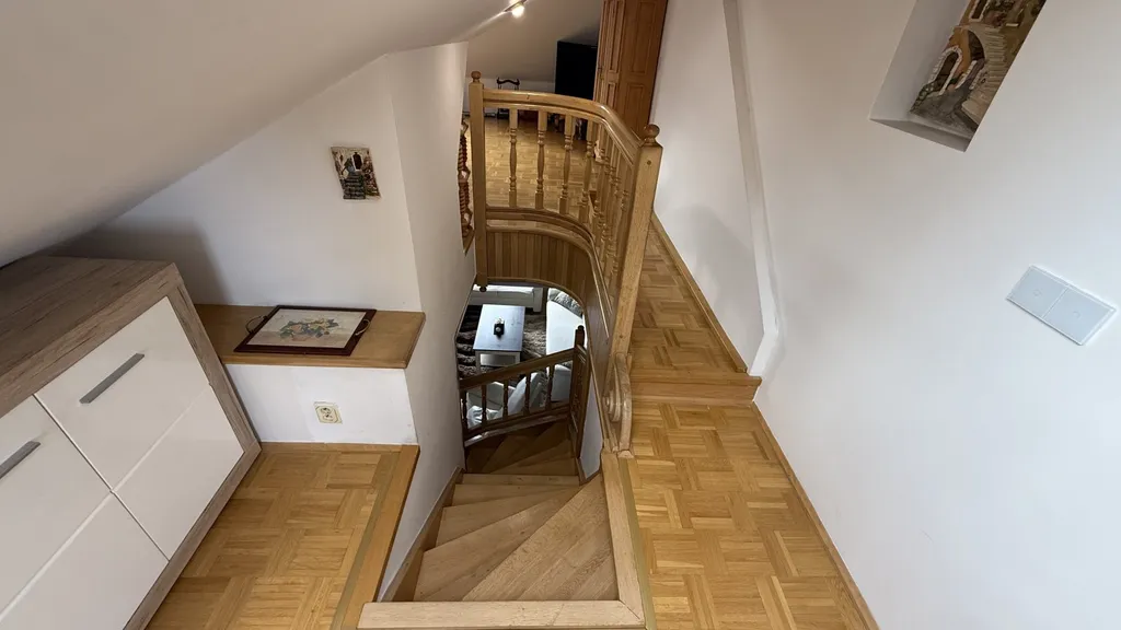 V patře se nachází menší pracovna a dvě ložnice. Podkroví má dřevěnou podlahu a jeho dispozice je řešena pomocí SDK dělící příčky. Ta nezasahuje do obvodových konstrukcí a lze ji kdykoliv demontovat, čímž vznikne otevřený a velkorysý prostor dle individuálních potřeb.